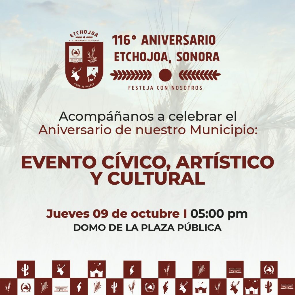 “Este aniversario es de todos; de nuestras familias, nuestras comunidades y de nuestros pueblos originarios que dan identidad y fortaleza a Etchojoa. Los esperamos para celebrar juntos la historia, cultura y grandeza de nuestra tierra”, invitó el Alcalde, Ing. Luis Arturo Robles Higuera.