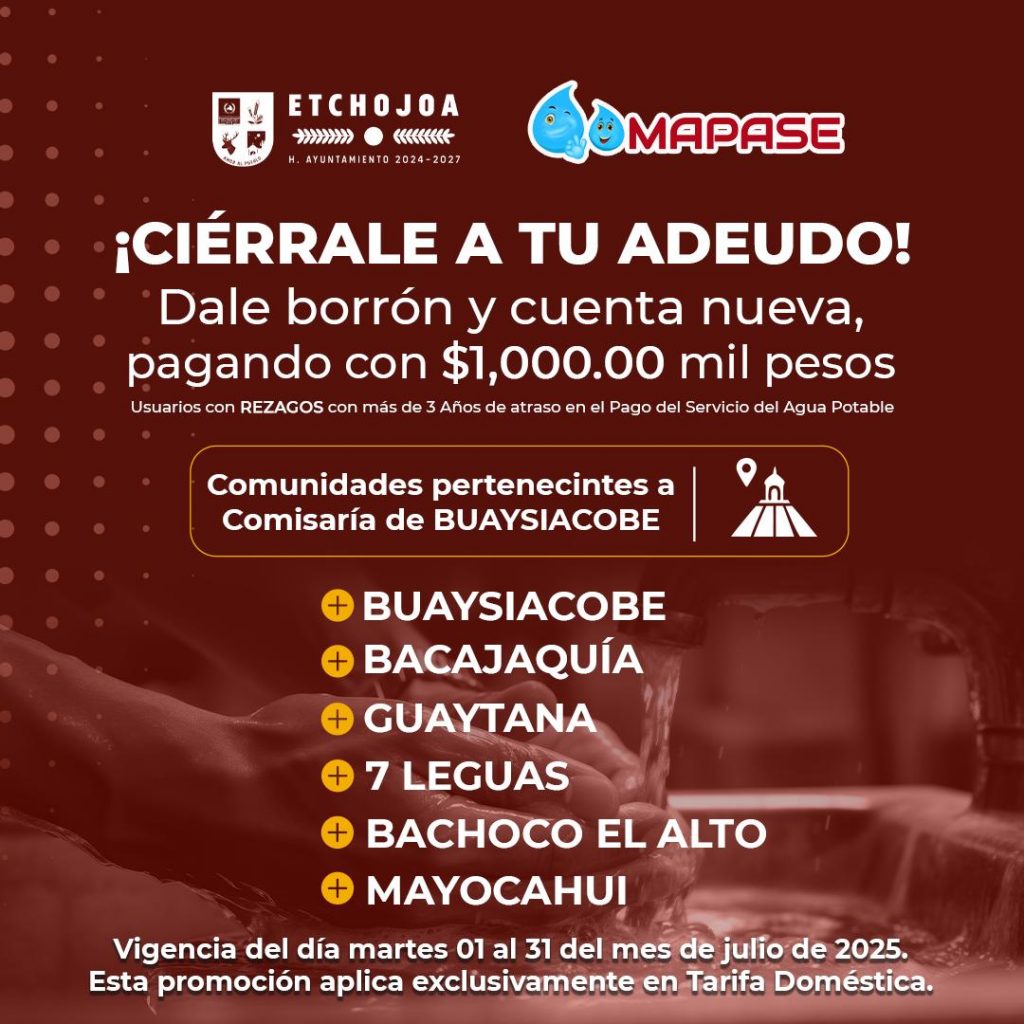 El Gobierno Municipal de Etchojoa que encabeza el Ing. Luis Arturo Robles Higuera, en coordinación con OOMAPASE, invita a las y los ciudadanos con rezagos mayores a 3 años en el pago del servicio de agua potable a aprovechar esta gran oportunidad:
