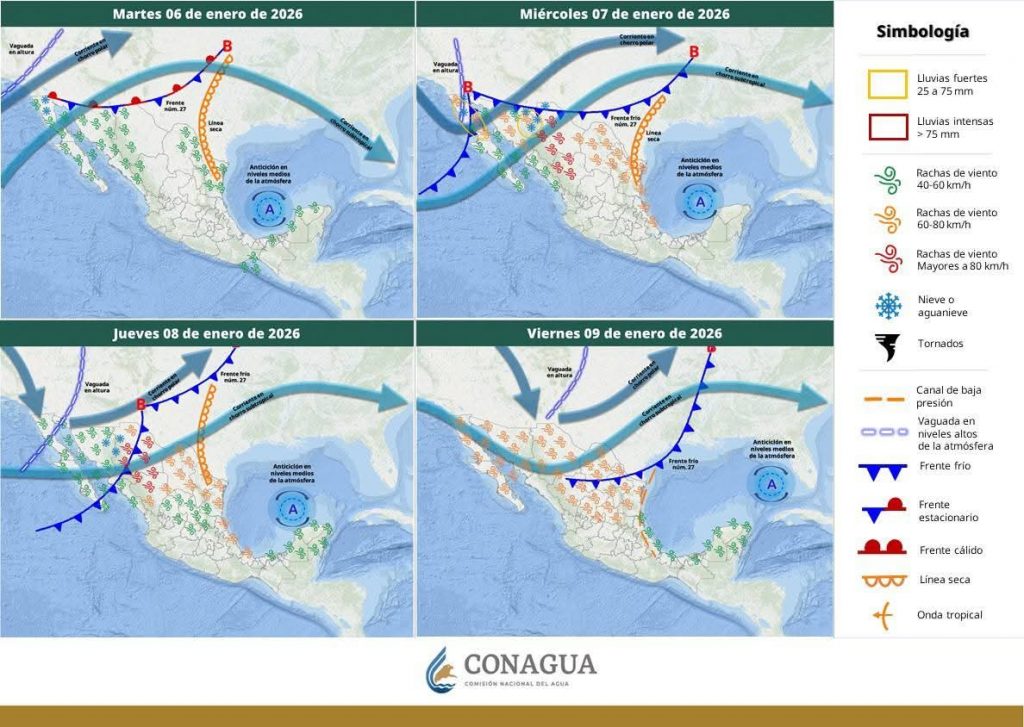 Durante hoy, la corriente en chorro subtropical y la corriente en chorro polar estarán originando cielos parcialmente nublados sobre la mayor parte del estado. Simultáneamente, el frente frío (núm. 27) se aproximará al noroeste del país, el cual, se prevé se aproxime e ingrese al territorio estatal durante el día miércoles 07 de enero ocasionando lluvias de ligeras a moderadas(0.5 a 25mm) sobre las regiones del centro, oriente y norte. A su vez, un descenso en las temperaturas con valores mínimos que oscilen entre los -5 a los 0°C sobre la zona montañosa de Sonora. Por su parte, el ingreso de dicho sistema originará rachas de viento de moderadas a fuertes sobre el oriente y noreste durante su paso. También, mantiene la probabilidad de caída de nieve/aguanieve sobre municipios limítrofes con Chihuahua para el día jueves por la madrugada.