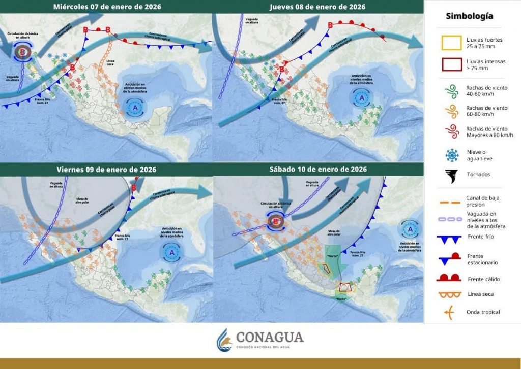 Durante hoy, el frente frío (núm. 27) en interacción con las corrientes en chorro polar y subtropical y con una vaguada en niveles altos de la atmósfera, ocasionarán lluvias de ligeras a moderadas (0.5 a 25mm) sobre las regiones del noroeste, centro, oriente y norte. A su vez, un descenso en las temperaturas con valores mínimos que oscilen entre los -5 a los 0°C sobre la zona montañosa de Sonora. Por su parte, el ingreso de dicho sistema originará rachas de viento de moderadas a fuertes sobre el noroeste, oriente y noreste a su paso. También, mantiene la probabilidad de caída de nieve/aguanieve sobre municipios limítrofes con Chihuahua para el día jueves por la madrugada.