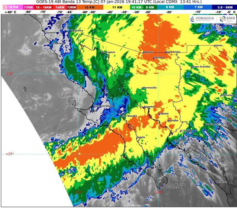 Posteriormente, durante la tarde-noche de hoy este sistema avanzará hacia el oriente, dejando lluvias moderadas sobre municipios del río Sonora así como localidades de la Sierra Madre. Aunado a esto, existe la probabilidad de caída de nieve/aguanieve sobre las cumbres de la región montañosa de Mesa Tres Ríos en Nácori Chico.