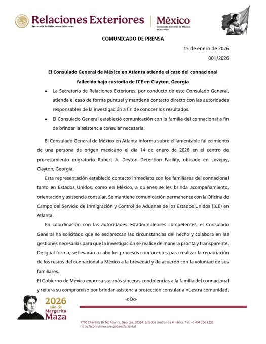 La representación consular precisó que el connacional se encontraba detenido en el Robert A. Deyton Detention Facility, localizado en Lovejoy, dentro del condado de Clayton, cuando ocurrió el fallecimiento. El caso fue confirmado públicamente el jueves 15 de enero por el Consulado de México en Atlanta, dependencia que señaló que el asunto ya es atendido de manera directa.