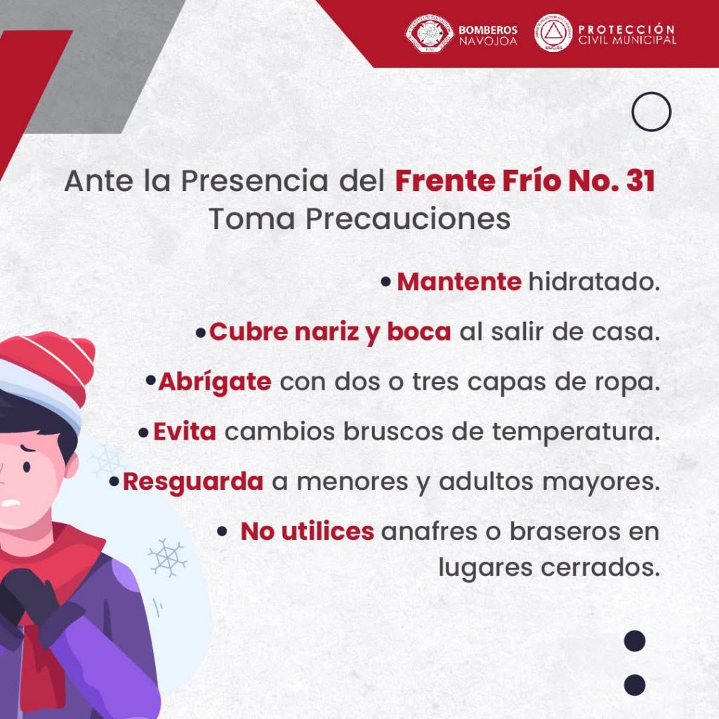 Entre las principales recomendaciones están el abrigarse con dos o tres capas de ropa; evitar cambios bruscos de temperatura; mantenerse bien hidratado; cubrir nariz y boca al salir de casa; resguardar a menores de edad y adultos mayores; y no utilizar anafres o braceros en lugares cerrados.