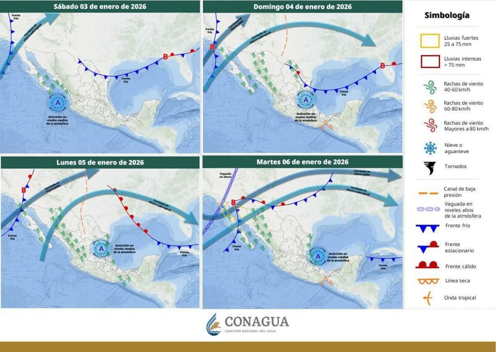 Finalmente, un nuevo frente frío se aproximará al noroeste del país durante los días 06 y 07 de enero generando lluvias de ligeras a moderadas sobre el noroeste y norte de Sonora, un descenso de temperaturas marcado y rachas de viento fuertes sobre dicho sector.