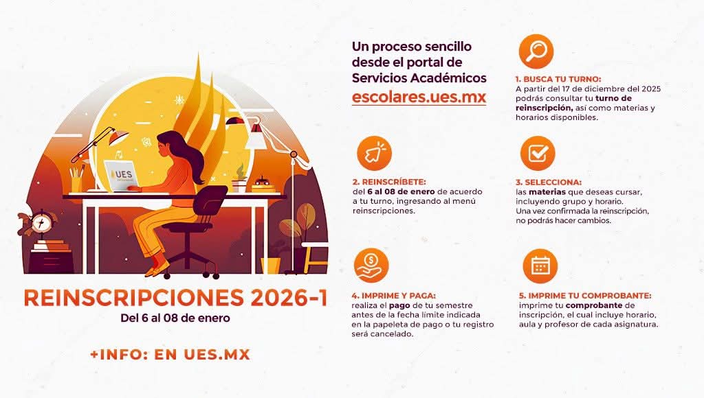 Quienes aspiren a integrarse por primera vez a la Universidad Estatal de Sonora – UES podrán consultar la Convocatoria de Nuevo Ingreso 2026 a finales de febrero en https://aspirantes.ues.mx/; en tanto que la información paso a paso sobre las reinscripciones se encuentra disponible en ues.sonora.edu.mx/alumnos/reinscripciones.