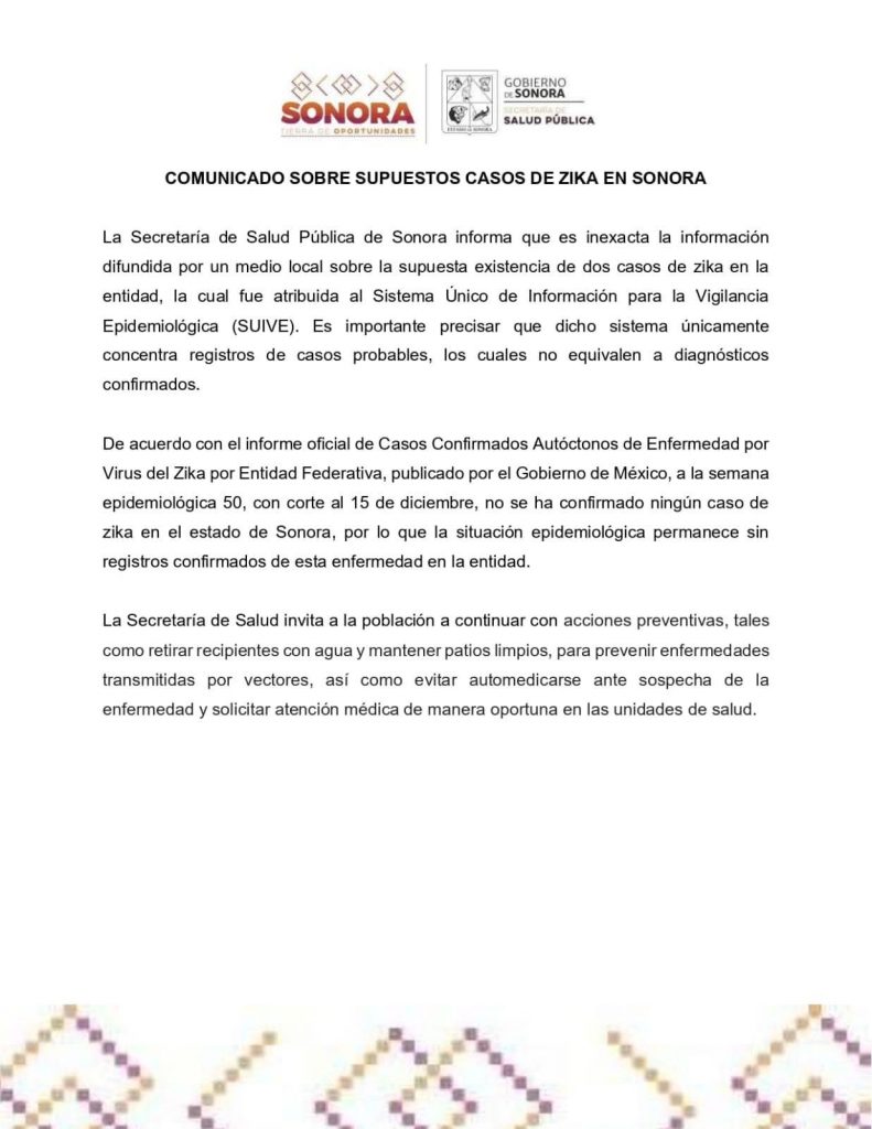 ESTATAL PRINCIPAL COMUNICADO DE LA SECRETARÍA DE SALUD SONORA. Administrador enero 4, 2026 0 #Zika Comparte esto: Haz clic para compartir en Facebook (Se abre en una ventana nueva) Facebook Click to share on X (Se abre en una ventana nueva) X Haz clic para compartir en WhatsApp (Se abre en una ventana nueva) WhatsApp Me gusta esto:Me gusta Cargando... Post navigation Previous: PUNTO DE VISTA // TABLOIDE INFORMATIVO.Next: COMUNICADO DE LA Secretaría de Educación y Cultura. Más historias COLUMNAS ESTATAL PRINCIPAL Elecciones del tipo que sean, apasionan. Administrador enero 31, 2026 0 COLUMNAS PRINCIPAL MTRO. VÍCTOR VALENCIA LE DICE ADIÓS AL CBTA 97; SE JUBILA. Administrador enero 31, 2026 0 ESTATAL PRINCIPAL CON LIDERAZGO DE GOBERNADOR DURAZO SE FORTALECE EL CAMPO SONORENSE; CRECE 18% ACTIVIDAD PRIMARIA Administrador enero 29, 2026 Deja un comentario Cancelar respuestaTu dirección de correo electrónico no será publicada. Los campos obligatorios están marcados con *Comentario * Nombre * Correo electrónico * Web Guardar mi nombre, correo electrónico y sitio web en este navegador para la próxima vez que haga un comentario.