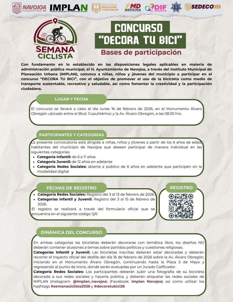 Navojoa, Sonora, 3 de febrero 2026.- En promoción al uso de la bicicleta como medio de transporte ecológico, económico, saludable y propiciador de convivencia, se desarrollará en Navojoa la “Semana Ciclista 2026”, del 16 al 20 de febrero próximo, y que incluye desde concurso de decoración de unidades, una pedaleada urbana, hasta una novedosa función de bici cinema.