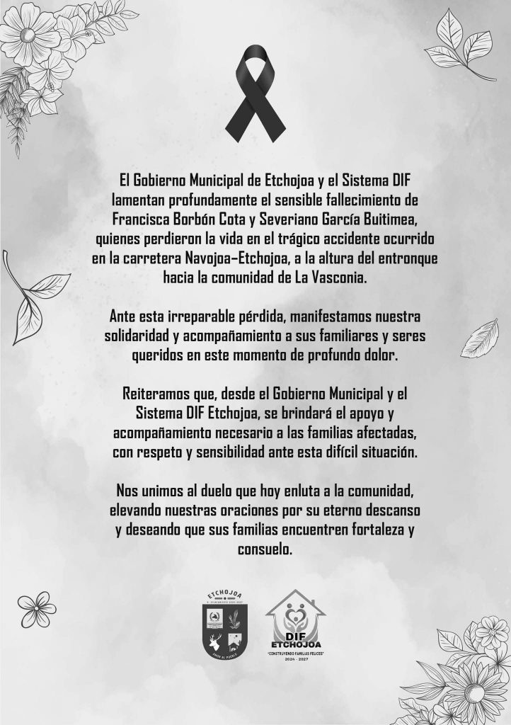 El Gobierno de Etchojoa que Preside el Ing. Arturo Robles Higuera, presidente y su esposa, la Mtra. Karla Minú Cano Arce, presidenta del Sistema DIF Municipal, Miembros del Cabildo Municipal y personal del H. Ayuntamiento de Etchojoa, expresan sus más sinceras condolencias por el sensible fallecimiento de Francisca Borbón Cota y Severiano García Buitimea, quienes perdieron la vida en el trágico accidente registrado en la carretera Navojoa-Etchojoa, a la altura del entronque hacia la comunidad de La Vasconia.