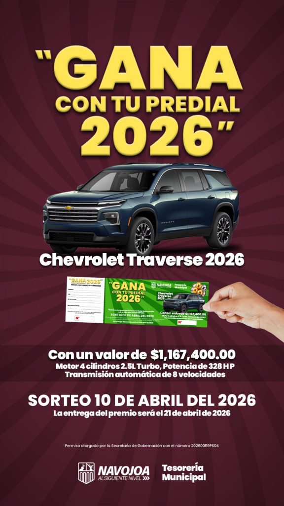 Navojoa, Sonora, 25 de marzo 2026.- En agradecimiento y estímulo a los contribuyentes que hayan pagado el impuesto predial del presente año, en el período enero-marzo, el gobierno del alcalde Jorge Alberto Elías arrancó este miércoles la promoción “Gana con tu Predial 2026”, en la cual será sorteada una Chevrolet Traverse 2026, el 10 de abril próximo, teniendo oportunidad de recoger boletos hasta el 09 de ese mismo mes.