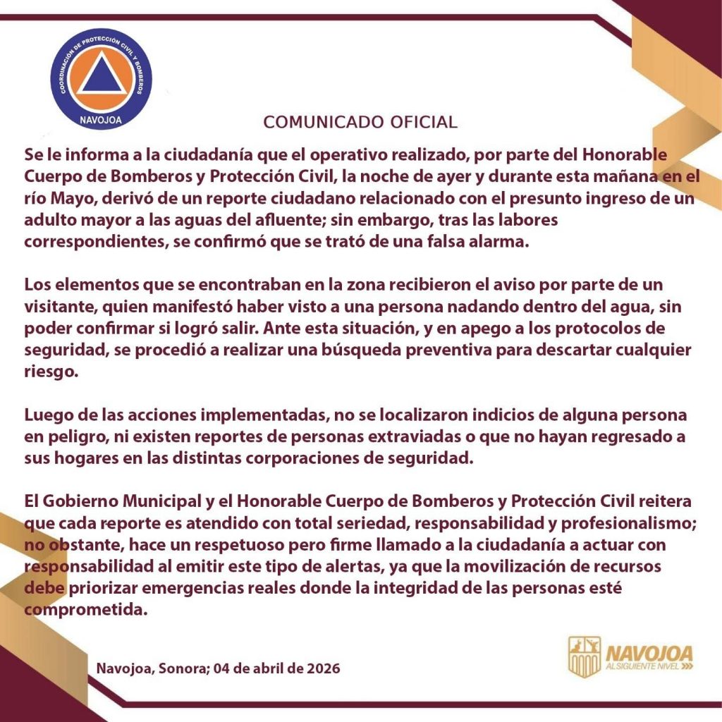 COMUNICADO:FALSA ALARMA RELACIONADA CON ADULTO MAYOR QUE AYER INGRESO A AGUAS DEL RÍO MAYO.