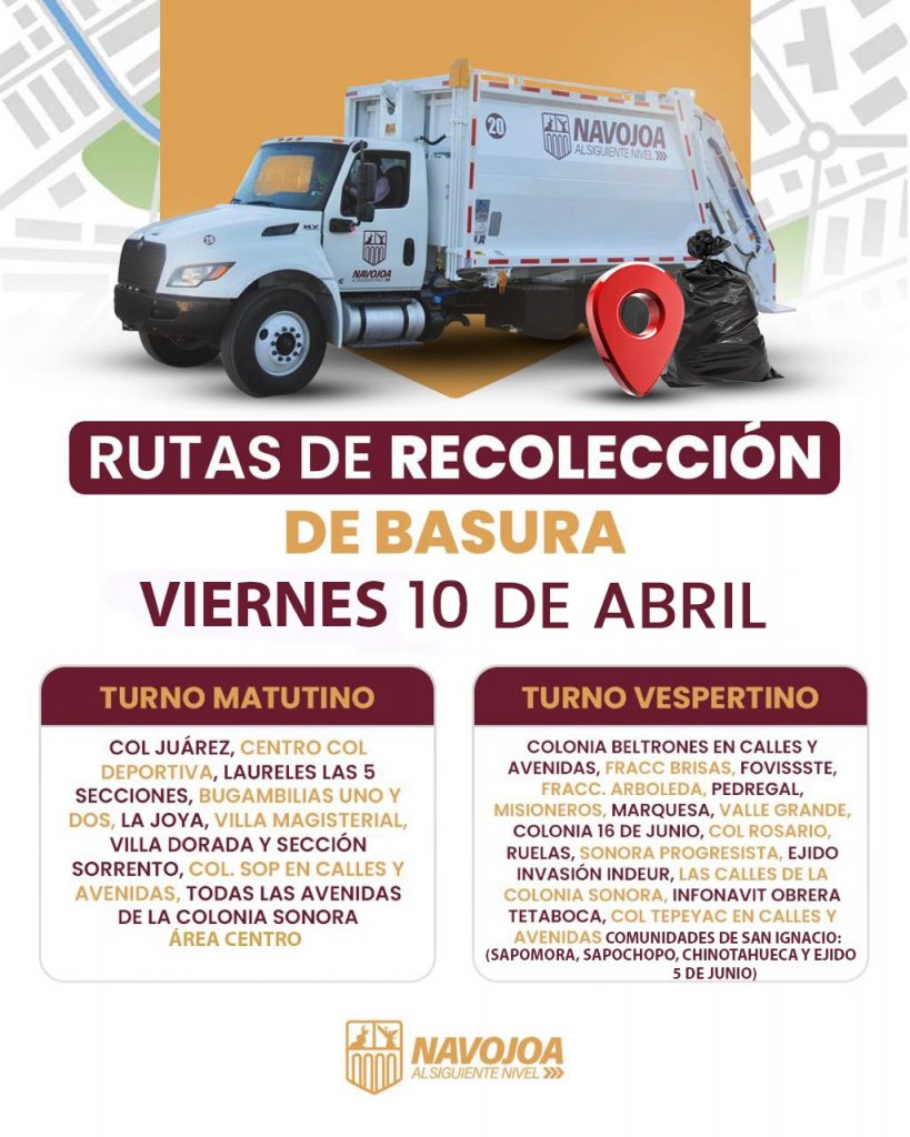 LIMPIEZA DESCACHARRE NAVOJOA PRINCIPAL ¡ATENCIÓN AMIGOS DE NAVOJOA!. Administrador abril 9, 2026 0 Rutas de recolección de basura, para MAÑANA viernes 10 de abril: Comparte esto: Comparte en Facebook (Se abre en una ventana nueva) Facebook Share on X (Se abre en una ventana nueva) X Share on WhatsApp (Se abre en una ventana nueva) WhatsApp Me gusta esto:Me gusta Cargando... Post navigation Previous: 86% DE LAS ESCUELAS CAMBIARON SUS MENÚS A UN AÑO DE LA RESTRICCIÓN DE COMIDA CHATARRA: MARIO DELGADONext: INHABILITAN TÚNEL CLANDESTINO EN NOGALES, SONORA Más historias NAVOJOA PRINCIPAL SERVIDOR PÚBLICO ENTREGAN ASCENSOS A 120 POLICÍAS MUNICIPALES. Administrador abril 15, 2026 0 AGUA COMUNICADO HUATABAMPO PRINCIPAL Queda solucionada la MEGA FUGA originada en el ACUEDUCTO de “Las Guayabas”. Infoma Oomapas Huatabampo Administrador abril 14, 2026 0 COMUNICADO HUATABAMPO PRINCIPAL Comunicado. Administrador abril 14, 2026 0 Deja un comentario Cancelar respuestaTu dirección de correo electrónico no será publicada. Los campos obligatorios están marcados con *Comentario * Nombre * Correo electrónico * Web Guardar mi nombre, correo electrónico y sitio web en este navegador para la próxima vez que haga un comentario.