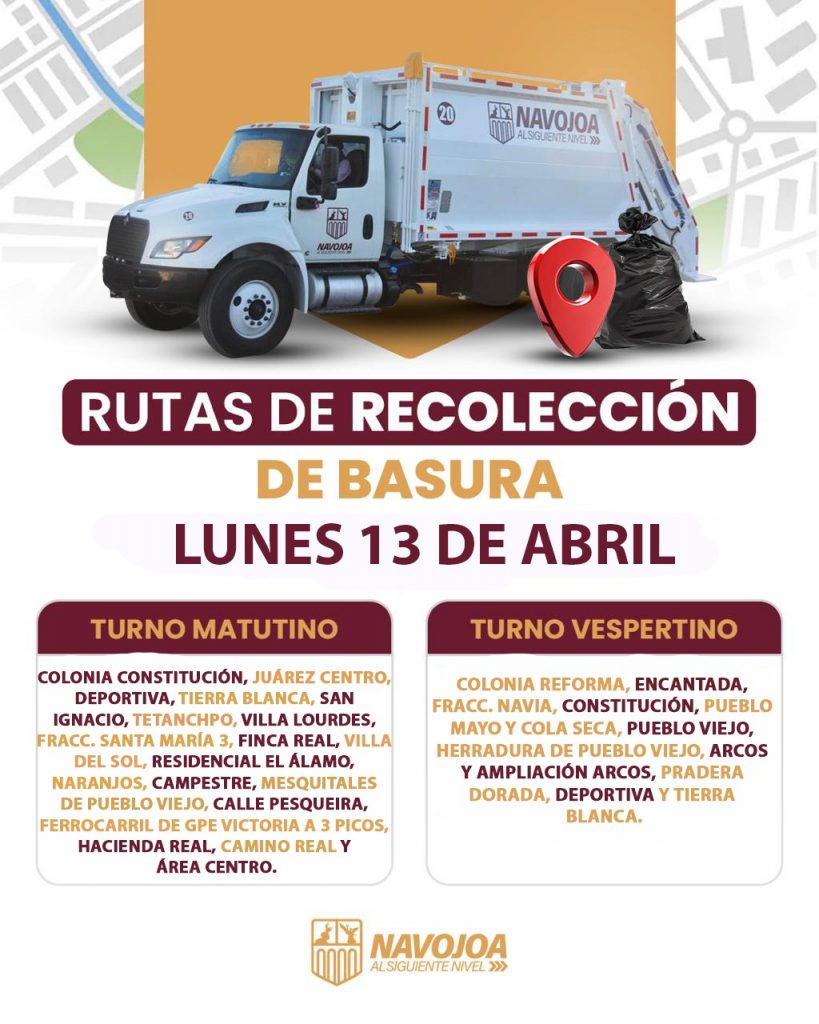 COMUNICADO LIMPIEZA DESCACHARRE NAVOJOA PRINCIPAL ATENCIÓN AMIGOS NAVOJOENSES. Administrador abril 12, 2026 0 Rutas de recolección de basura, lunes 13 de abril Comparte esto: Comparte en Facebook (Se abre en una ventana nueva) Facebook Share on X (Se abre en una ventana nueva) X Share on WhatsApp (Se abre en una ventana nueva) WhatsApp Me gusta esto:Me gusta Cargando... Post navigation Previous: 3 MIL 800 TIANGUIS CAMPESINOS DE SEMBRANDO VIDA CONTRIBUYEN A LA ALIMENTACIÓN SALUDABLE EN MÉXICONext: GOBERNADOR DURAZO Y SEDATU ENTREGAN ESCRITURAS Y FORTALECEN CERTEZA PATRIMONIAL EN SONORA Más historias NAVOJOA PRINCIPAL SERVIDOR PÚBLICO ENTREGAN ASCENSOS A 120 POLICÍAS MUNICIPALES. Administrador abril 15, 2026 0 AGUA COMUNICADO HUATABAMPO PRINCIPAL Queda solucionada la MEGA FUGA originada en el ACUEDUCTO de “Las Guayabas”. Infoma Oomapas Huatabampo Administrador abril 14, 2026 0 COMUNICADO HUATABAMPO PRINCIPAL Comunicado. Administrador abril 14, 2026 0 Deja un comentario Cancelar respuestaTu dirección de correo electrónico no será publicada. Los campos obligatorios están marcados con *Comentario * Nombre * Correo electrónico * Web Guardar mi nombre, correo electrónico y sitio web en este navegador para la próxima vez que haga un comentario.