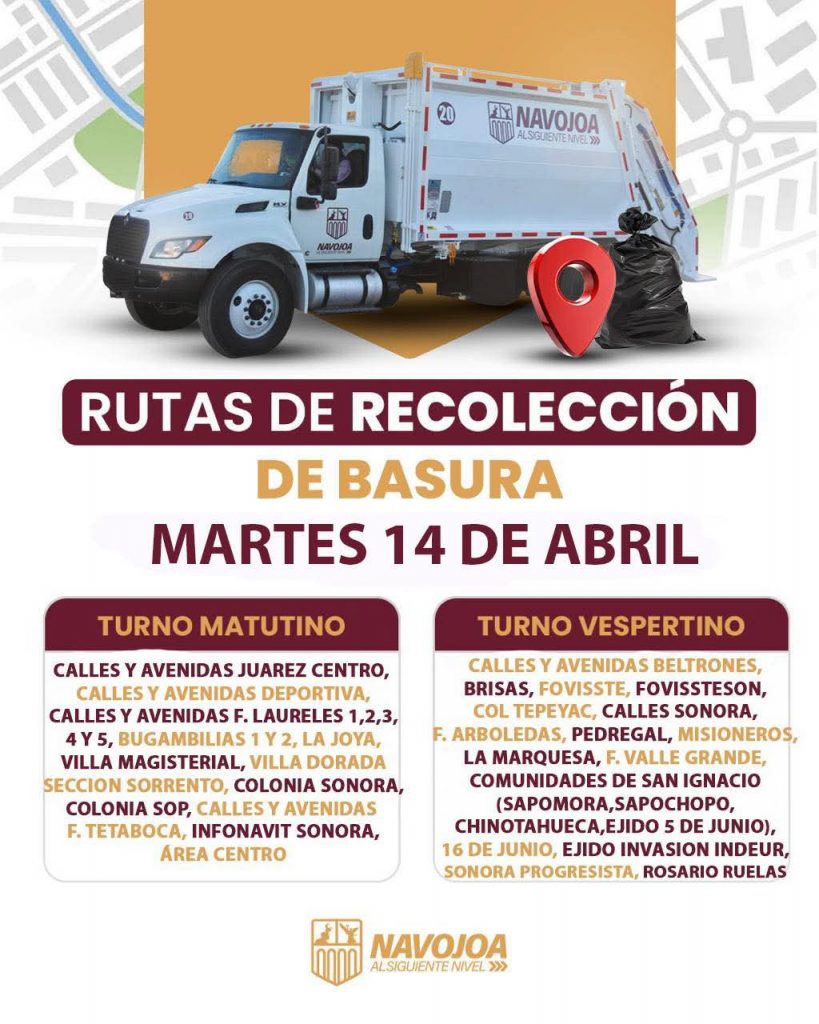 LIMPIEZA DESCACHARRE NAVOJOA PRINCIPAL RECOLECCI脫N DE BASURA EN NAVOJOA. Administrador abril 14, 2026 0 馃殯馃毌Rutas de recolecci贸n de basura | martes 14 de abril. Comparte esto: Comparte en Facebook (Se abre en una ventana nueva) Facebook Share on X (Se abre en una ventana nueva) X Share on WhatsApp (Se abre en una ventana nueva) WhatsApp Me gusta esto:Me gusta Cargando... Post navigation Previous: 馃馃毇 Jornadas de Descacharre en Navojoa.Next: Cecytes Emsad de Santamaria Del Buaraje recibe autob煤s. M谩s historias NAVOJOA PRINCIPAL SERVIDOR P脷BLICO ENTREGAN ASCENSOS A 120 POLIC脥AS MUNICIPALES. Administrador abril 15, 2026 0 AGUA COMUNICADO HUATABAMPO PRINCIPAL Queda solucionada la MEGA FUGA originada en el ACUEDUCTO de “Las Guayabas”. Infoma Oomapas Huatabampo Administrador abril 14, 2026 0 COMUNICADO HUATABAMPO PRINCIPAL Comunicado. Administrador abril 14, 2026 0 Deja un comentario Cancelar respuestaTu direcci贸n de correo electr贸nico no ser谩 publicada. Los campos obligatorios est谩n marcados con *Comentario * Nombre * Correo electr贸nico * Web Guardar mi nombre, correo electr贸nico y sitio web en este navegador para la pr贸xima vez que haga un comentario.