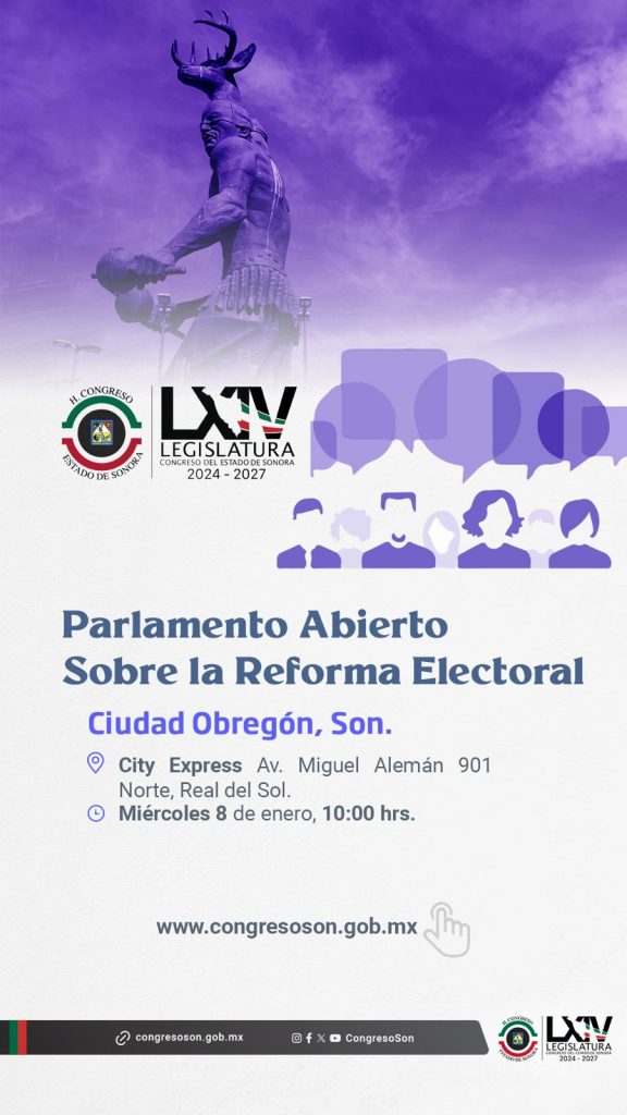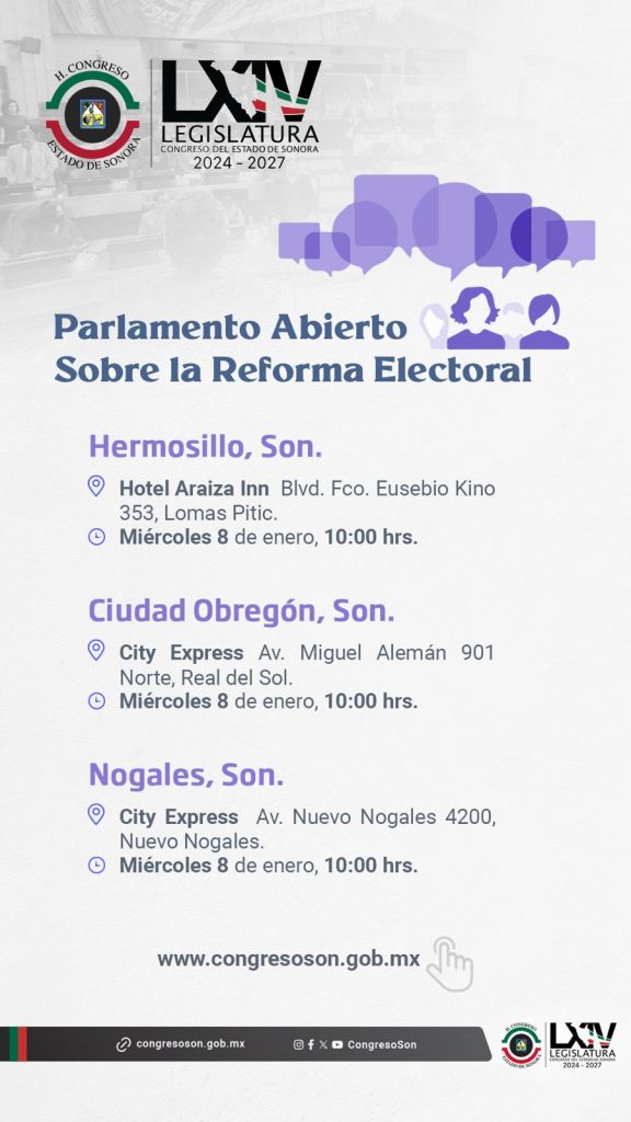 Hermosillo, Sonora; 7 de enero de 2025.- Con el propósito de fomentar la participación ciudadana en torno a la reforma a la Ley de Instituciones y Procedimientos Electorales del Estado, en el marco de la reforma al Poder Judicial local, el Congreso de Sonora reiteró su invitación a las personas interesadas a sumarse a los ejercicios de Parlamento Abierto que se llevarán a cabo este miércoles 8 de enero en Hermosillo, Cajeme y Nogales.