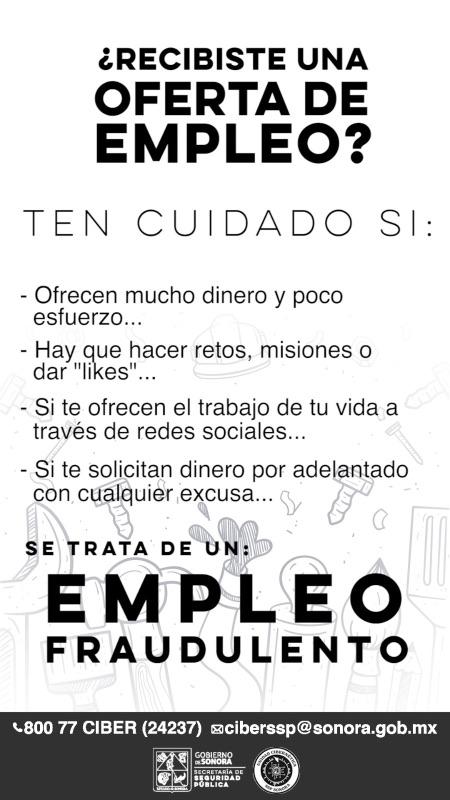 Ante esta modalidad de fraude, la Unidad Cibernética alertó a quien busca empleo a no caer en estafas evitando proporcionar información personal y en caso de requerir asesorías comunicarse al teléfono 800-77-Ciber (24237) y correo electrónico ciberssp@sonora.gob.mx.