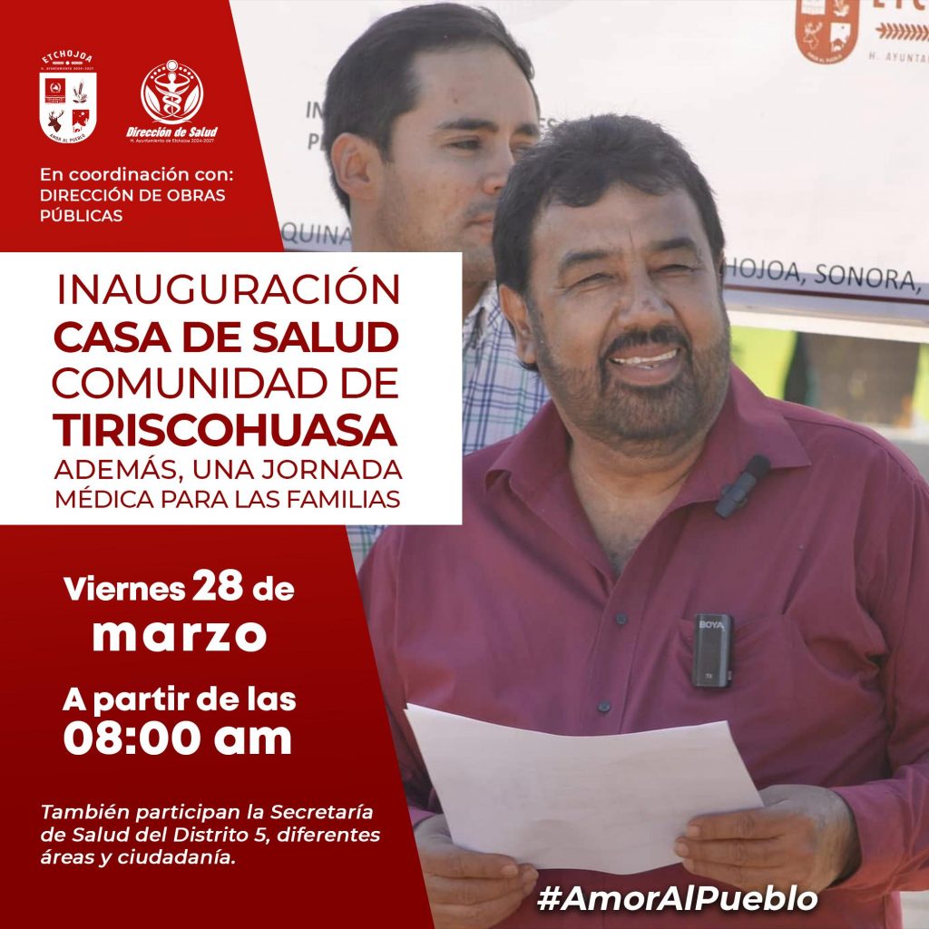 Etchojoa, Son.- El Gobierno Municipal, a través de la Dirección de Salud, invita a la inauguración de la nueva Casa de Salud en la comunidad de Tiriscohuasa, Etchojoa; este importante evento será encabezado por el Alcalde, Ing. Luis Arturo Robles Higuera.