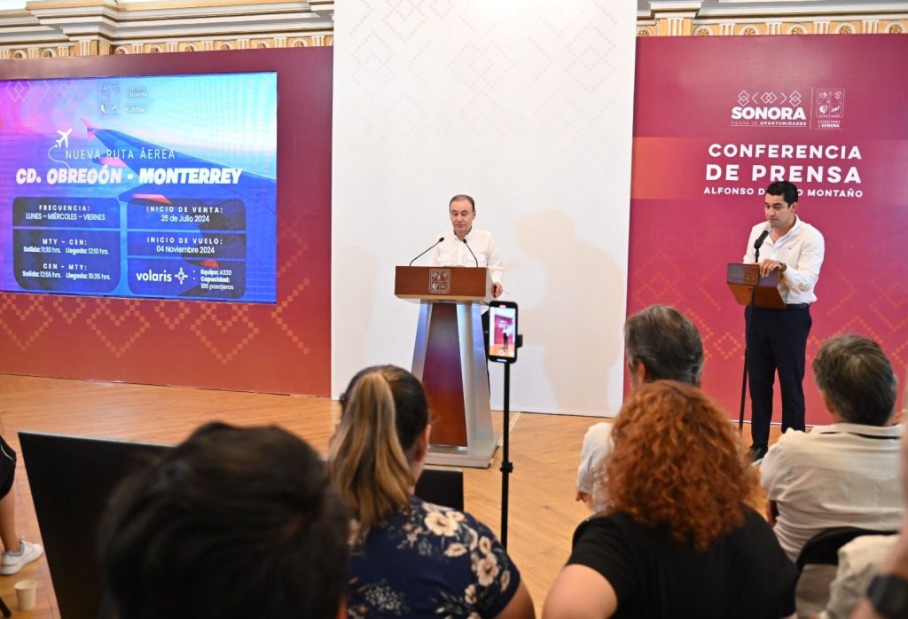 “Dos nuevos vuelos, uno de ellos desde Ciudad Obregón a Monterrey a partir del 4 de noviembre iniciamos este vuelo con Volaris; y tenemos un nuevo vuelo de Obregón al AIFA a través de Viva Aerobus”, indicó.