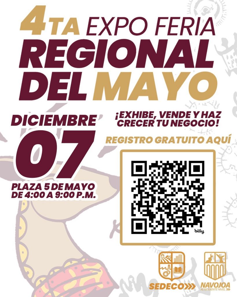 Navojoa, Sonora; a 01 de diciembre de 2025. Con el objetivo de fortalecer la economía local y regional impulsando productos artesanales, gastronómicos y culturales que reflejan la identidad y el talento de nuestra gente, el Gobierno Municipal de Navojoa, a través de la Secretaría de Desarrollo Económico Municipal, anunció la realización de la 4ta Expo Feria Regional del Mayo,