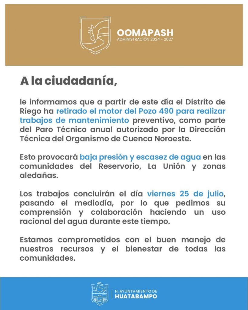 💧 ¡Atención! Habrá baja presión y escasez de agua por mantenimiento en el Pozo 490.