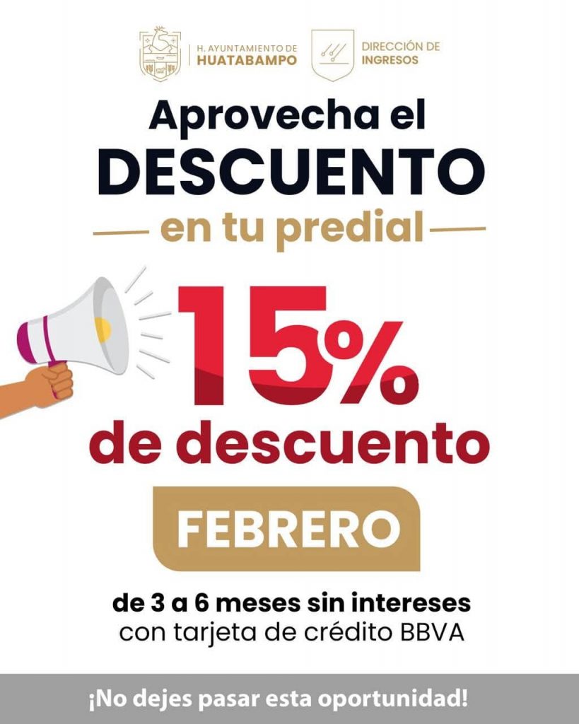 Amigos de la “Tierra de Generales”, el Gobierno de Huatabampo te invita a aprovechar el 15% de descuento en tu predial en este mes de febrero!.