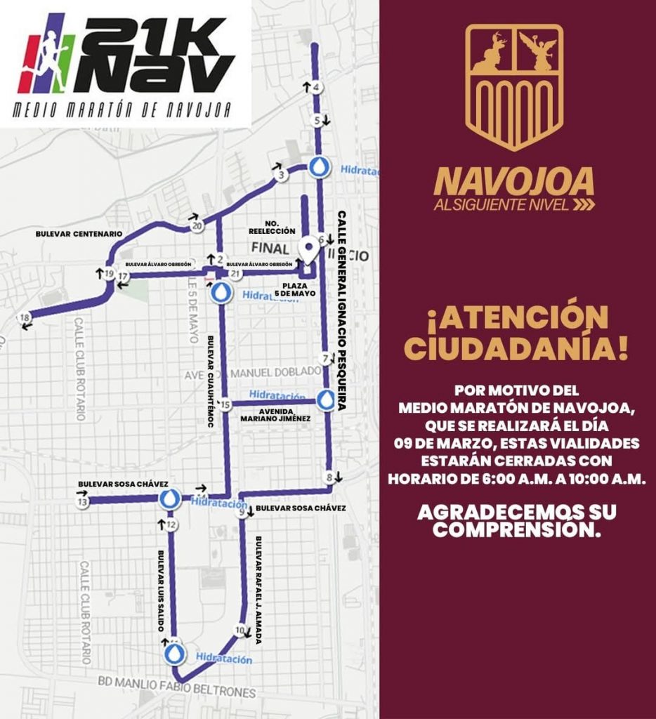 Este próximo 9 de marzo, el municipio será parte de una experiencia única: ¡el primer Maratón 21kNav! Por lo que algunas calles de la ciudad estarán cerradas para garantizar la seguridad de los corredores y espectadores.