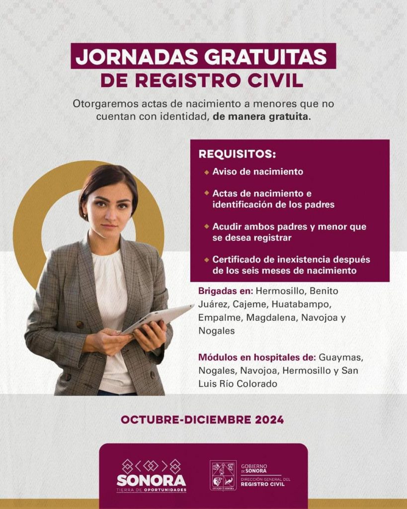 En el Gobierno del Estado de Sonora otorgaremos actas de nacimiento a menores que no cuenten con identidad de manera gratuita. Consulta toda la información en la imagen.