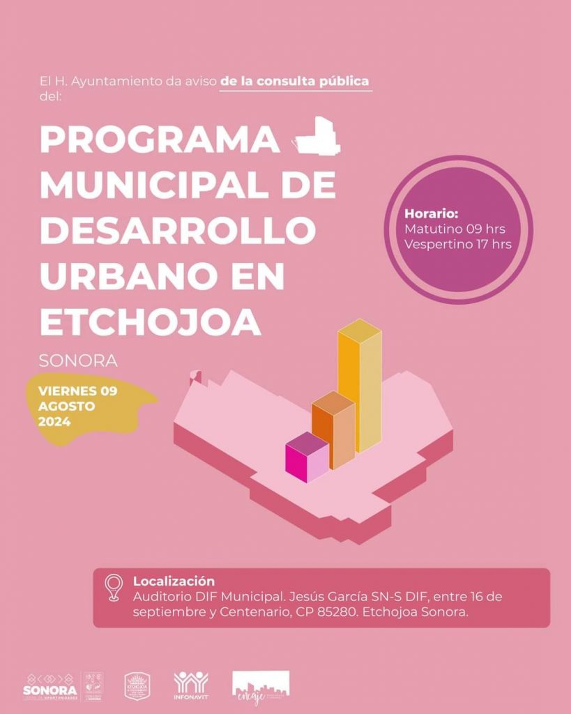 Para que las familias tengan mejores condiciones de vida, se fortalece el ‘PROGRAMA MUNICIPAL DE DESARROLLO URBANO EN ETCHOJOA Y SUS COMUNIDADES’, donde el próximo 9 de agosto se realizará en el Auditorio del Sistema DIF la consulta pública.