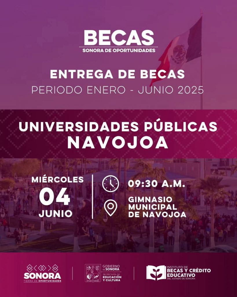 El Instituto de Becas y Crédito Educativo del Estado de Sonora les informa que la entrega de becas periodo enero – junio 2025 se realizará el miércoles 04 de junio a las 9:30 a.m.