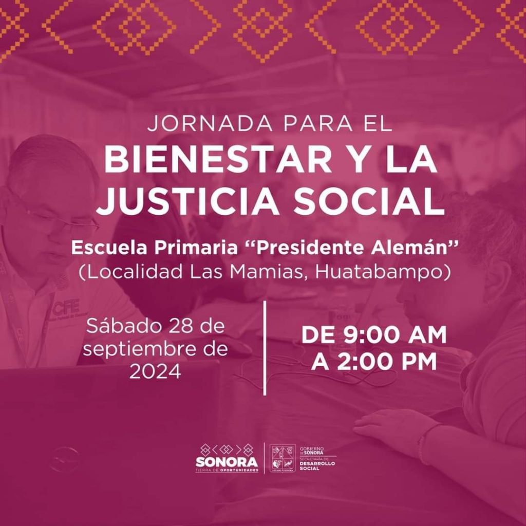 El Gobierno del Estado de Sonora en Coordinación con el Gobierno de Huatabampo Te invitan a la próxima Jornada para el Bienestar y la Justicia Social.