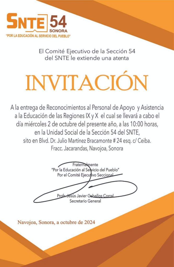 La Sección 54 del SNTE, te invita a la Entrega de Reconocimientos al Personal de Apoyo y Asistencia a la Educación de la Regiones IX y X, el cual se llevará a cabo mañana miércoles en la Unidad Social De Navojoa, Sonora.