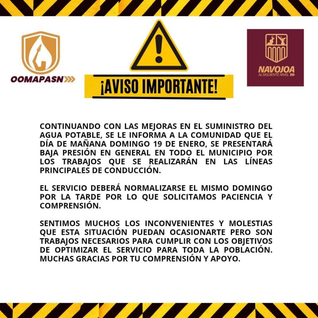 Continuando con las mejoras en el suministro del agua potable, se le informa a la comunidad que el día de mañana domingo 19 de enero, se presentará baja presión en general en todo el municipio por los trabajos que se realizarán en las líneas principales de conducción.