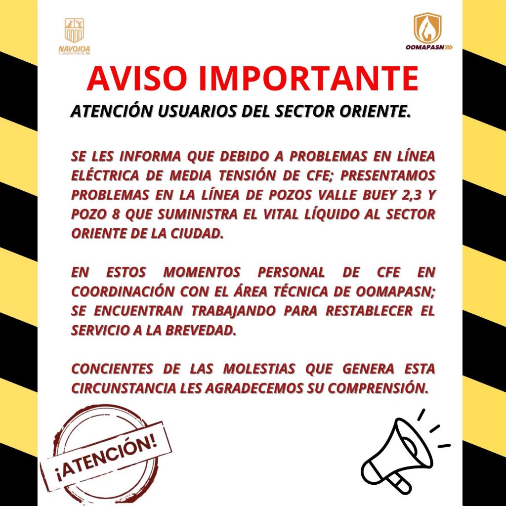 Se les informa que debido a problemas en linea electrica de media tensión de CFE; presentamos problemas en la linea de pozos Valle Buey 2,3 y pozo 8 que suministra el vital liquido al sector oritente de la ciudad.