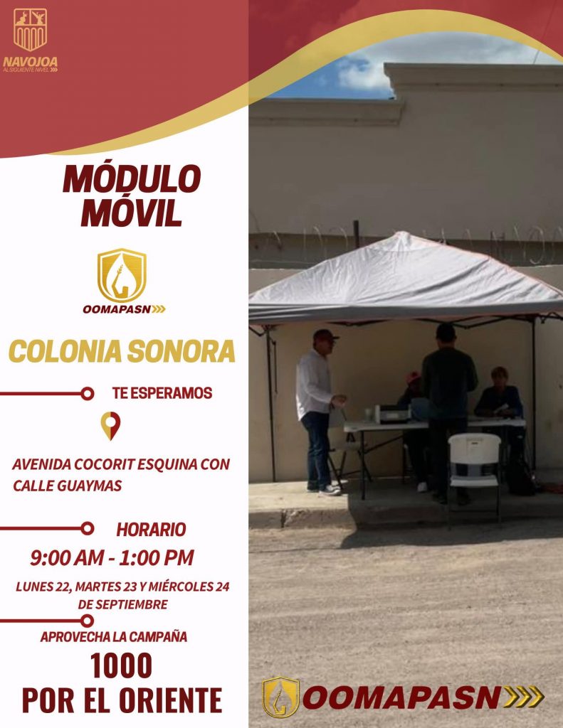 Navojoa, Son.- Para su mayor comodidad, Oomapas Navojoa estará atendiendo en su módulo móvil a los usuarios en la colonia Sonora, del Lunes 22 a Miércoles 24 de septiembre.