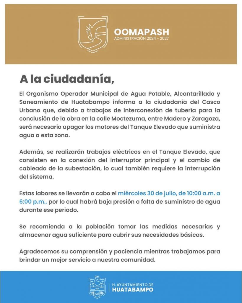 #Huatabampo; Oomapash Huatabampo envía comunicado inicando que el próximo miércoles 30 de julio, de 10 a.m. a 6 p.m., habrá baja presión o falta de agua en el Casco Urbano por trabajos en el Tanque Elevado.