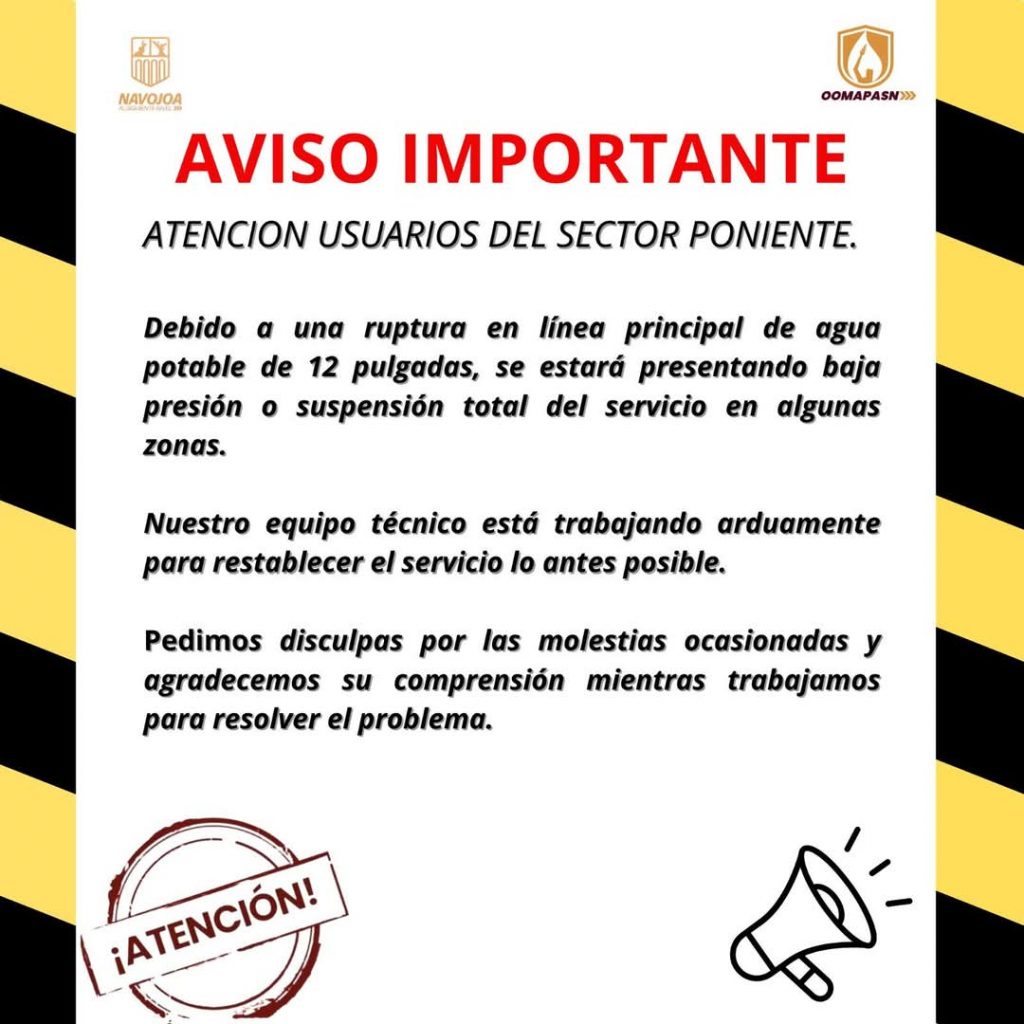 Debido a una ruptura en línea principal de agua potable de 12 pulgadas, se estará presentando baja presión o suspensión total del servicio en algunas zonas.