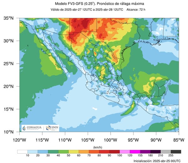 Hermosillo, Sonora.- A partir del día sábado 26 de abril, un frente frío se aproximará al noroeste de México, recorrerá el noroeste y norte del País, durante el domingo y lunes, se asociará con una vaguada en altura y con la corriente en chorro polar, provocando rachas muy fuertes de viento con tolvaneras en el norte, noreste y oriente de la Entidad. Se esperan rachas que oscilen desde los 60 a los 80 km/h durante el día domingo en dichas regiones.