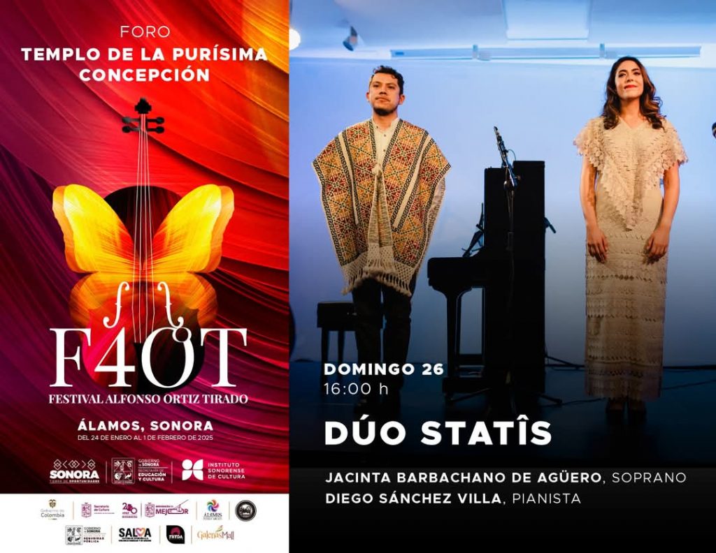A las 16:00 horas se presenta en el Foro Templo de la Purísima Concepción el Dúo Statîs, integrado por la soprano Jacinta Barbachano de Agüero y el pianista Diego Sánchez Villa.