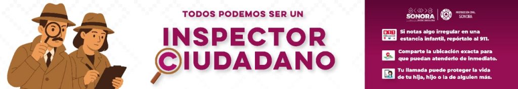 Sonora; 11 de noviembre de 2025.- Para lograr una protección más efectiva en favor de nuestros niños sonorenses, es necesario que autoridades y ciudadanos trabajemos juntos, por ello, y mediante el programa “Inspector Ciudadano” todos podemos denunciar las situaciones de riesgo que se localizan en las Instancias Infantiles; realiza la denuncia al 9-1-1.