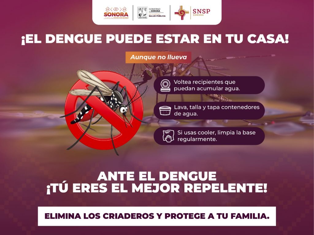Sonora; 14 de noviembre de 2025.- Protege a la familia contra el Dengue; no permitas la acumulación de agua en recipientes como fichas o cacharros, ni la creación de encharcamientos y protege los recipientes en los que almacenas el agua para el consumo del hogar. Recuerda que TÚ ERES EL MEJOR REPELENTE CONTRA EL DENGUE