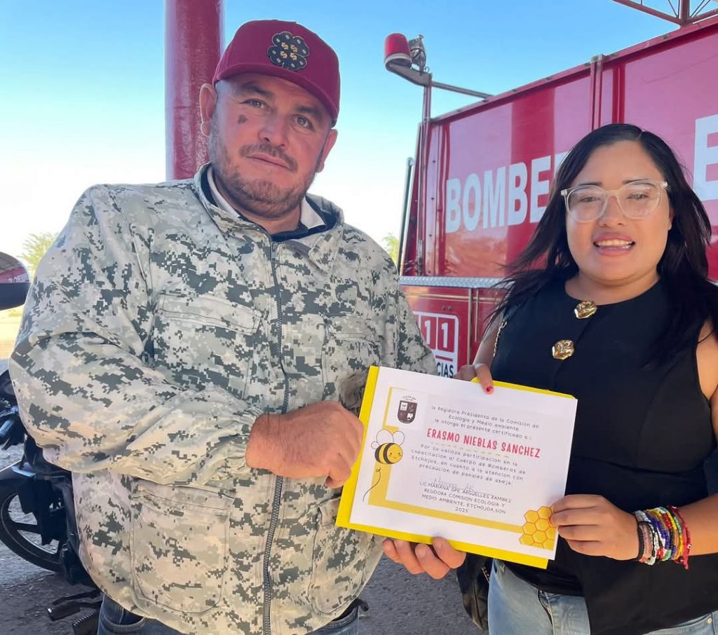 Etchojoa, Son.- Con el objetivo de fortalecer las capacidades de respuesta ante situaciones que involucren enjambres de abejas, el Cuerpo de Bomberos de Etchojoa y elementos de Protección Civil recibieron una capacitación especializada titulada ‘Manejo de Precaución de Enjambres de Abeja’, impartida por el experto Erasmo Nieblas Sánchez.