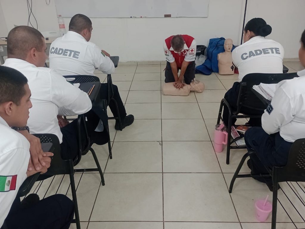 Cd. Obregón, Sonora.- Personal de la Cruz Roja Delegación Cajeme impartió un curso de primeros auxilios a las y los cadetes de la Academia de Policía Municipal, con el objetivo de dotarlos de conocimientos básicos para actuar de manera oportuna ante emergencias médicas.