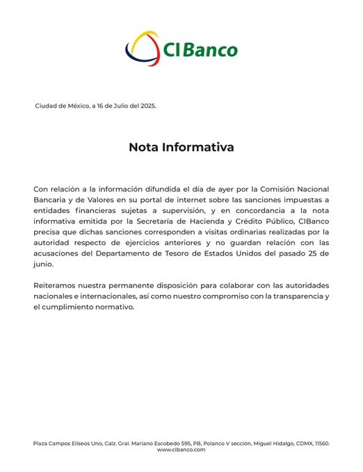 Cd. de México (agencias).- CIBanco emitió un comunicado este 16 de julio de 2025 en el que precisa que las sanciones impuestas por la Comisión Nacional Bancaria y de Valores (CNBV), recientemente publicadas en el portal del organismo regulador, no están relacionadas con las acusaciones del Departamento del Tesoro de Estados Unidos difundidas el pasado 25 de junio.