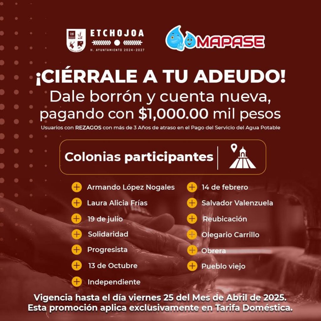 Etchojoa, Son.- El Gobierno Municipal, que Preside el Ing. Luis Arturo Robles Higuera, en colaboración con el Organismo Operador Municipal del Agua Potable, Alcantarillado y Saneamiento de Etchojoa (OOMAPASE), anuncian el programa ¡”Ciérrale a tu Adeudo”!, una promoción especial dirigida a los usuarios en diversas colonias del municipio.