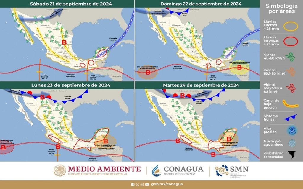 La onda tropical 24 se desplazará en la península de Yucatán, con una vaguada en niveles altos de la atmósfera, y se extenderá desde el oriente del Golfo de México hasta el sureste del país, y en proximidad de la vaguada monzónica del Pacífico Sur mexicano, traerá lluvias fuertes a muy fuertes con descargas eléctricas, rachas de viento y posible caída de granizo en aquellas regiones. También, se pronostican lluvias puntuales intensas en Oaxaca y Chiapas.
