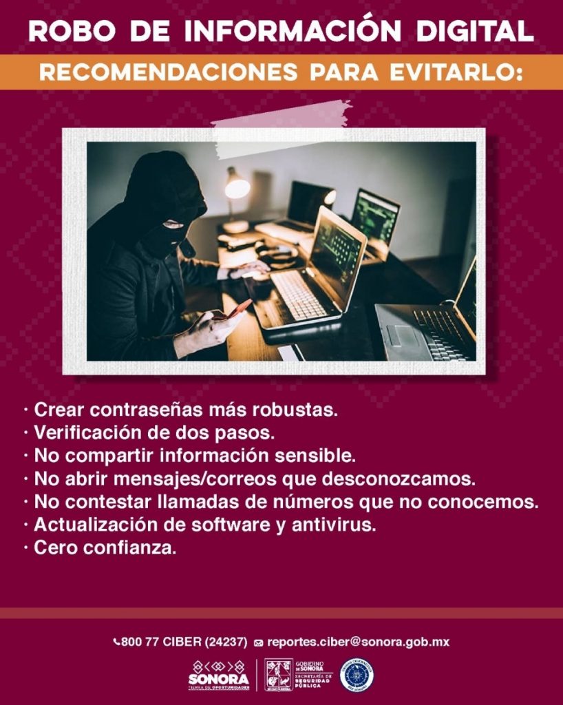 Hermosillo, Sonora.- En su carácter preventivo, la Secretaría de Seguridad Pública (SSP) del Gobierno de Sonora comparte con las y los ciudadanos información de utilidad para prevenir el robo de información digital y otros ciberdelitos.