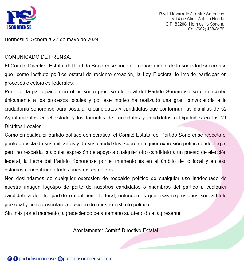 Comunicado del Partido Sonorense.