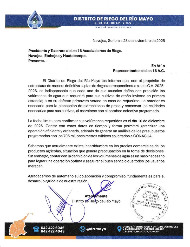 ETCHOJOA HUATABAMPO NAVOJOA PRINCIPAL COMUNICADO POR PARTE DEL Distrito de Riego del Rio Mayo. Administrador diciembre 1, 2025 0 Atención a las 16 Asociaciones de Riego. Navojoa, Etchojoa y Huatabampo. 💧 Comparte esto: Haz clic para compartir en Facebook (Se abre en una ventana nueva) Facebook Click to share on X (Se abre en una ventana nueva) X Haz clic para compartir en WhatsApp (Se abre en una ventana nueva) WhatsApp Me gusta esto:Me gusta Cargando... Post navigation Previous: SE ABRE REGISTRO PARA MUJERES BIENESTAR Y ADULTOS MAYORES.Next: “INSPECTOR CIUDADANO”. Más historias ESTATAL PRINCIPAL Gobernador Durazo inicia Operativo Navideño con más de 250 mil apoyos para familias de todo el estado. Administrador diciembre 12, 2025 0 ESTATAL PRINCIPAL Invita SEC a REALIZAR REGISTRO DE TALLAS ESCOLARES. Administrador diciembre 12, 2025 0 ETCHOJOA PRINCIPAL Entregan Canastas Alimentarias en Comunidades de la ComisarÃa de Buaysiacobe Administrador diciembre 12, 2025 0 Deja un comentario Cancelar respuestaTu dirección de correo electrónico no será publicada. Los campos obligatorios están marcados con *Comentario * Nombre * Correo electrónico * Web Guardar mi nombre, correo electrónico y sitio web en este navegador para la próxima vez que haga un comentario.