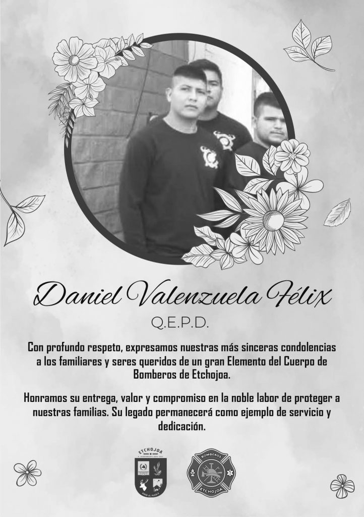 Con profundo dolor y respeto, el H. Ayuntamiento de Etchojoa se une a la pena que embarga a la familia, amigos y compañeros del valiente miembro del Cuerpo de Bomberos de Etchojoa, Daniel Valenzuela Félix.