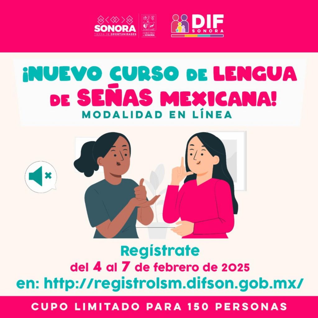 Hermosillo, Sonora.- Con el compromiso de fortalecer la inclusión y eliminar las barreras de comunicación, el Sistema para el Desarrollo Integral de la Familia en la Entidad (DIF Sonora) abre el registro para el Curso Básico de Lengua de Señas Mexicana (LSM) en modalidad en línea, dirigido a servidoras y servidores públicos, instituciones privadas y sociedad en general.