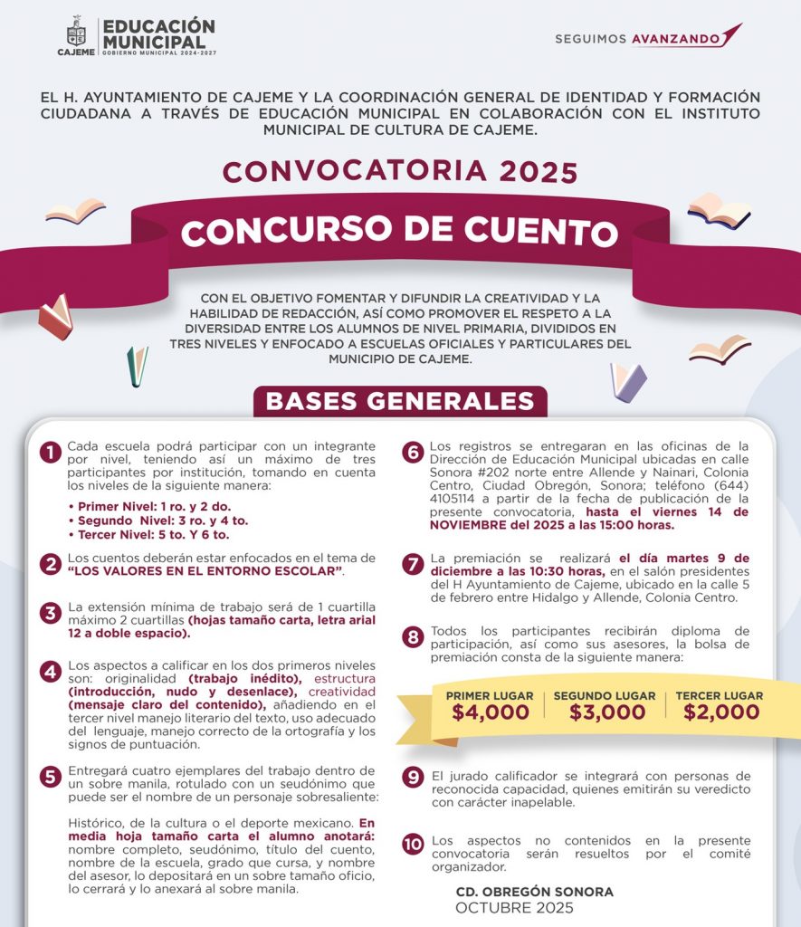 Cd. Obregón, Sonora.- Con el fin de fomentar y difundir la creatividad y la habilidad de redacción, así como promover el respeto a la diversidad entre alumnas y alumnos de nivel primaria, divididos en tres niveles y enfocado a escuelas públicas y privadas, el Gobierno Municipal y la Coordinación de Identidad y Formación Ciudadana, a través de Educación Municipal en colaboración con el Instituto Municipal de Cultura, convocan a participar en el Concurso de Cuento Infantil 2025.